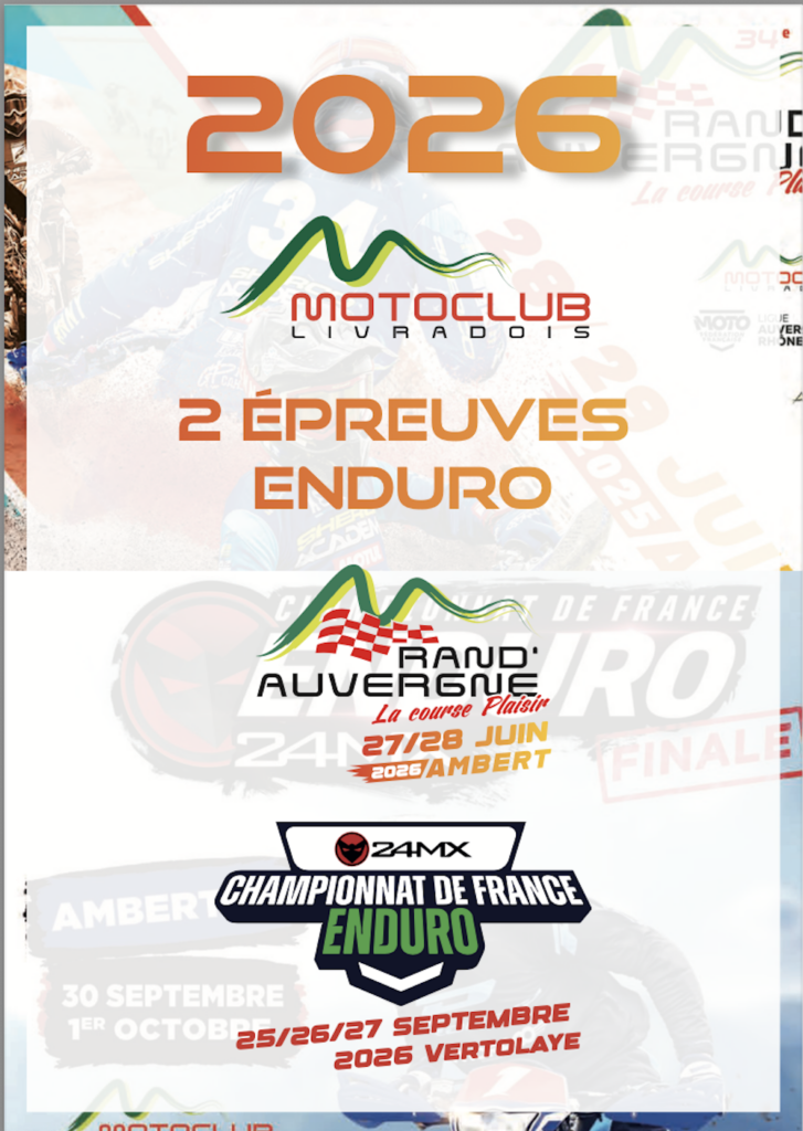 Pour cette année 2026 les amateurs d’enduro seront gâtés par le Moto Club du Livradois, puisque ce sont 2 compétitions d’envergures internationales qui sont proposés aux pilotes, au public et aux partenaires : la Rand’Auvergne pour sa 35ème édition et en Septembre une manche du Championnat de France.