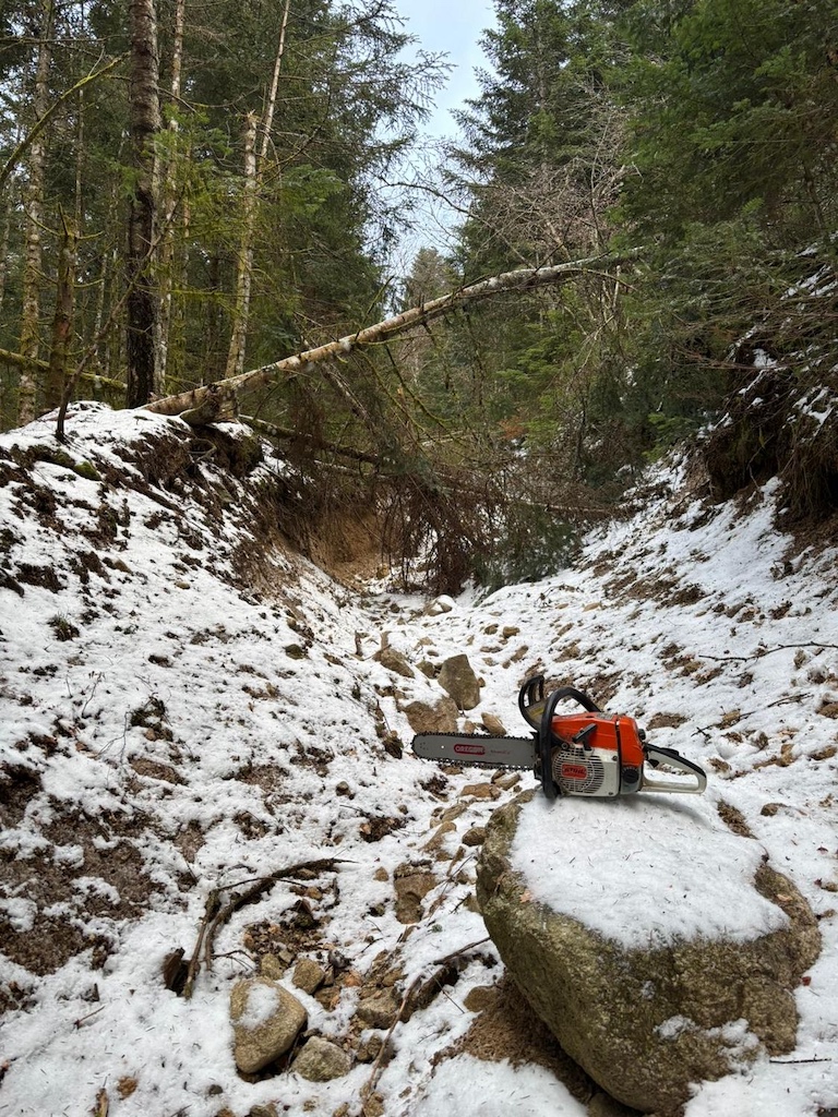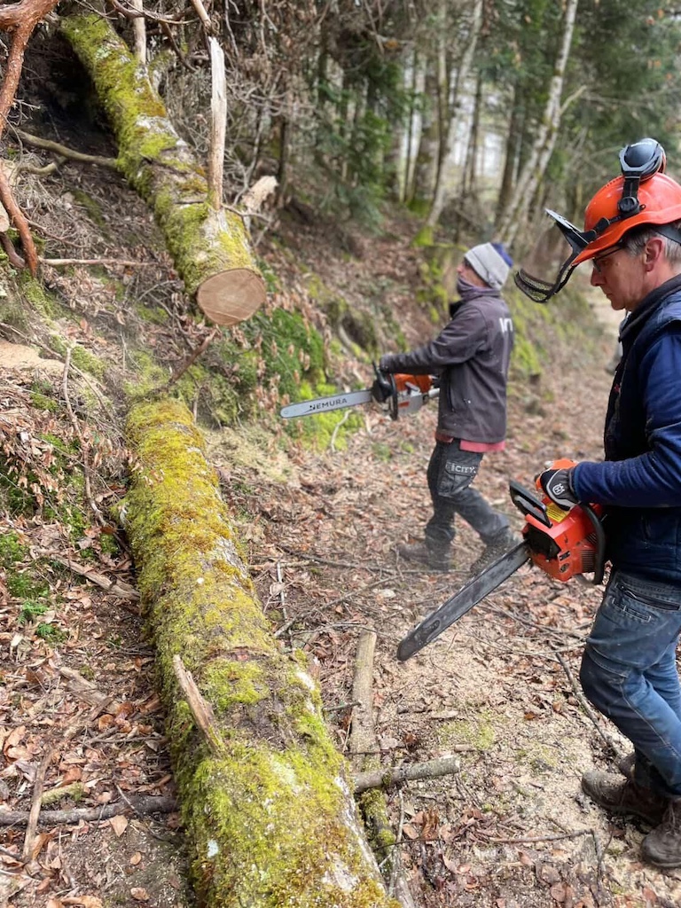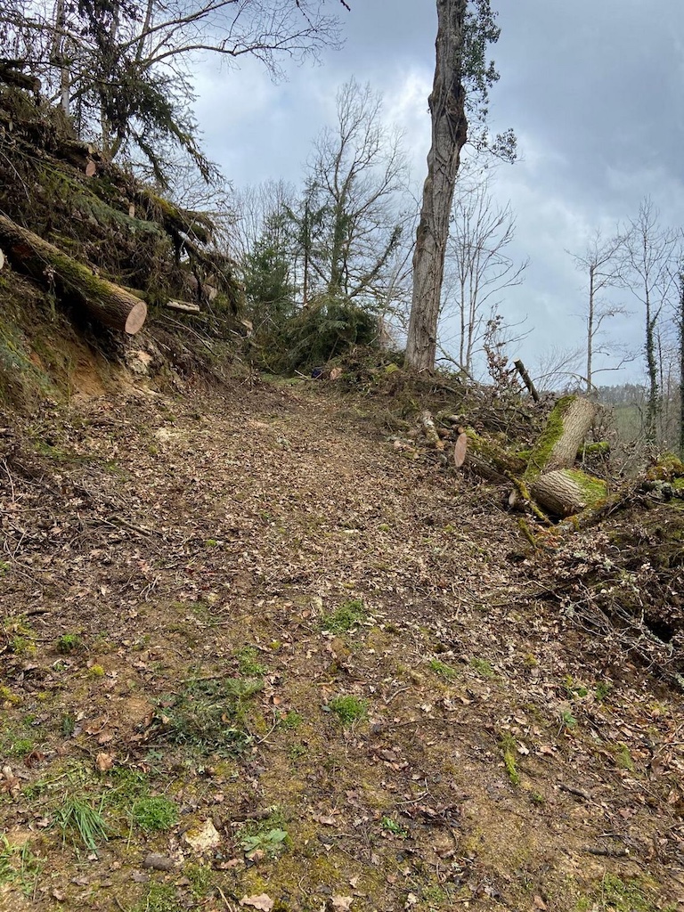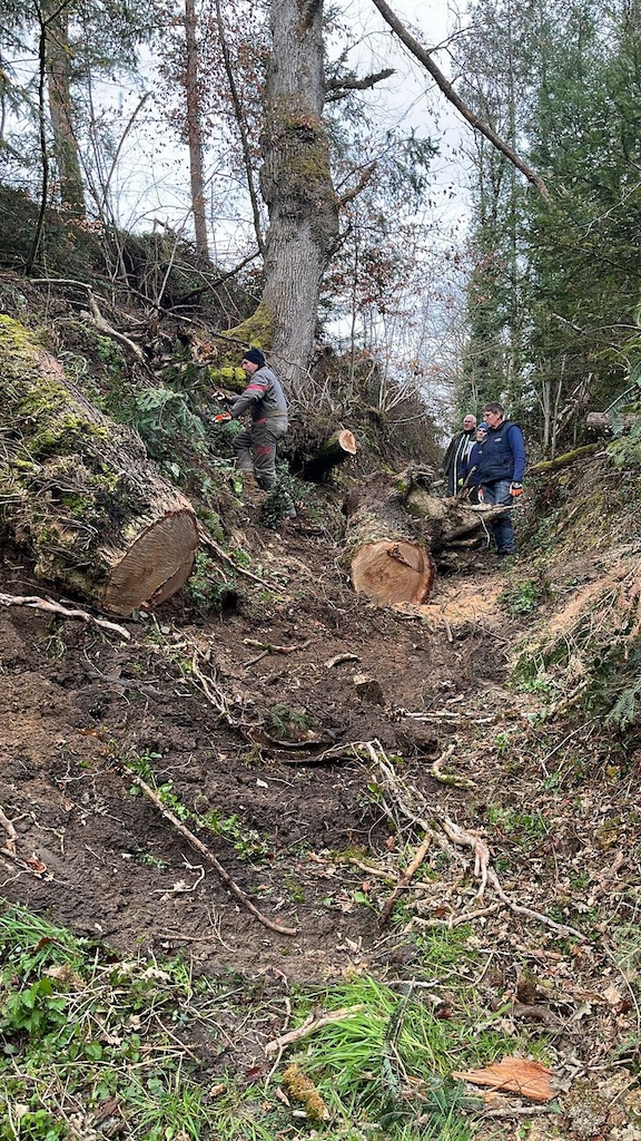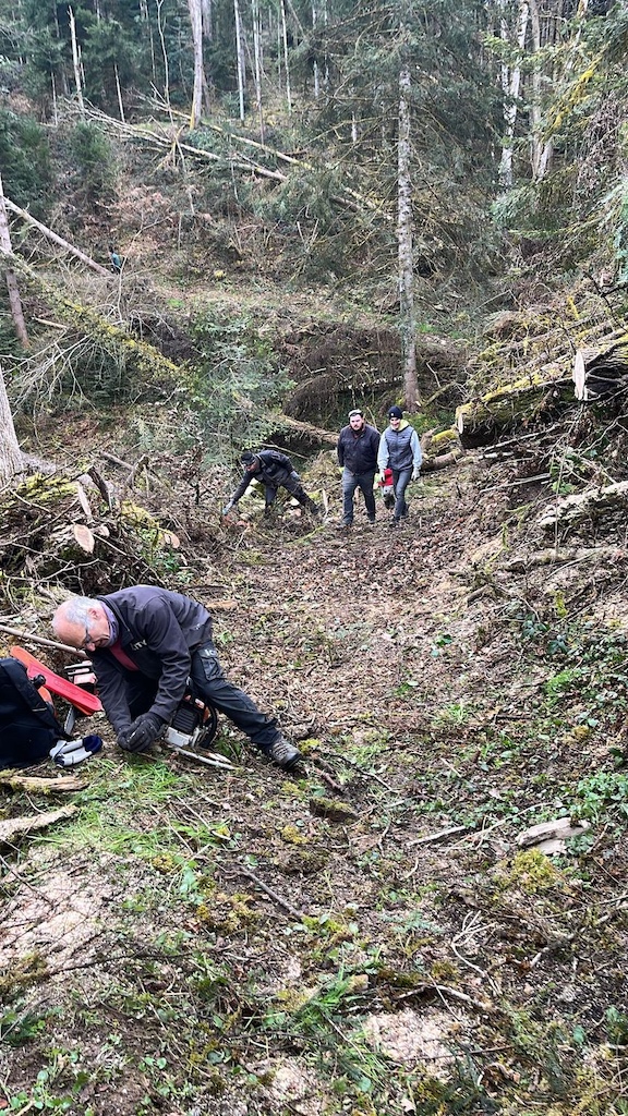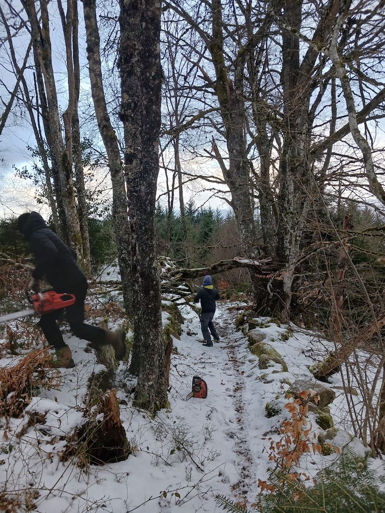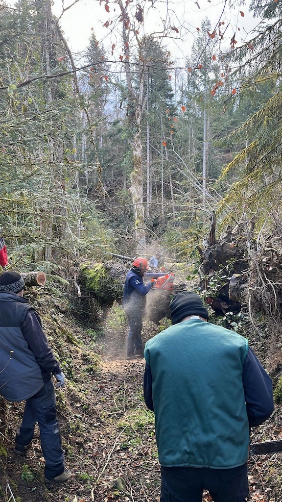 Deux équipes ont été constituées. L’une sur le secteur de Bertignat pour réouvrir le chemin entre Flouvat et le Bost. Ce dernier était complétement bouché suite à la tempête du 1er Juin 2025. Il a fallu déployer les gros moyens avec des engins forestiers et une pelleteuse afin de venir à bout des énormes arbres tombés en travers du sentier.