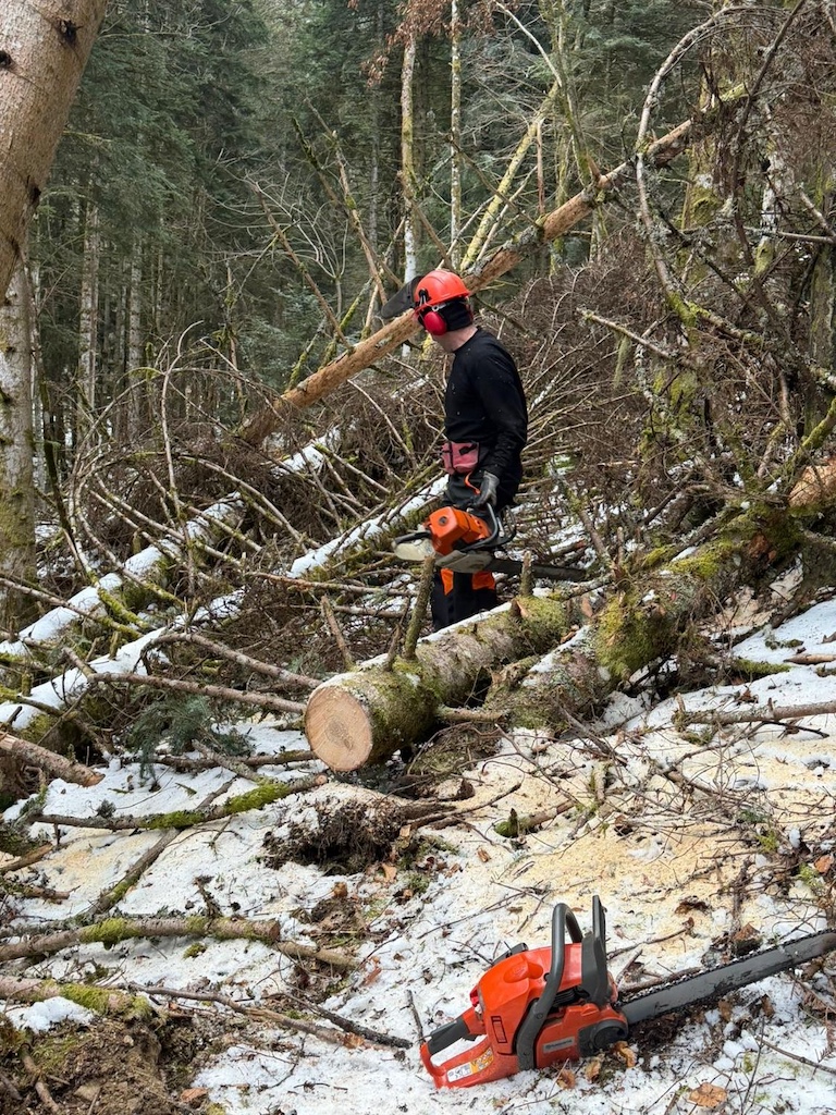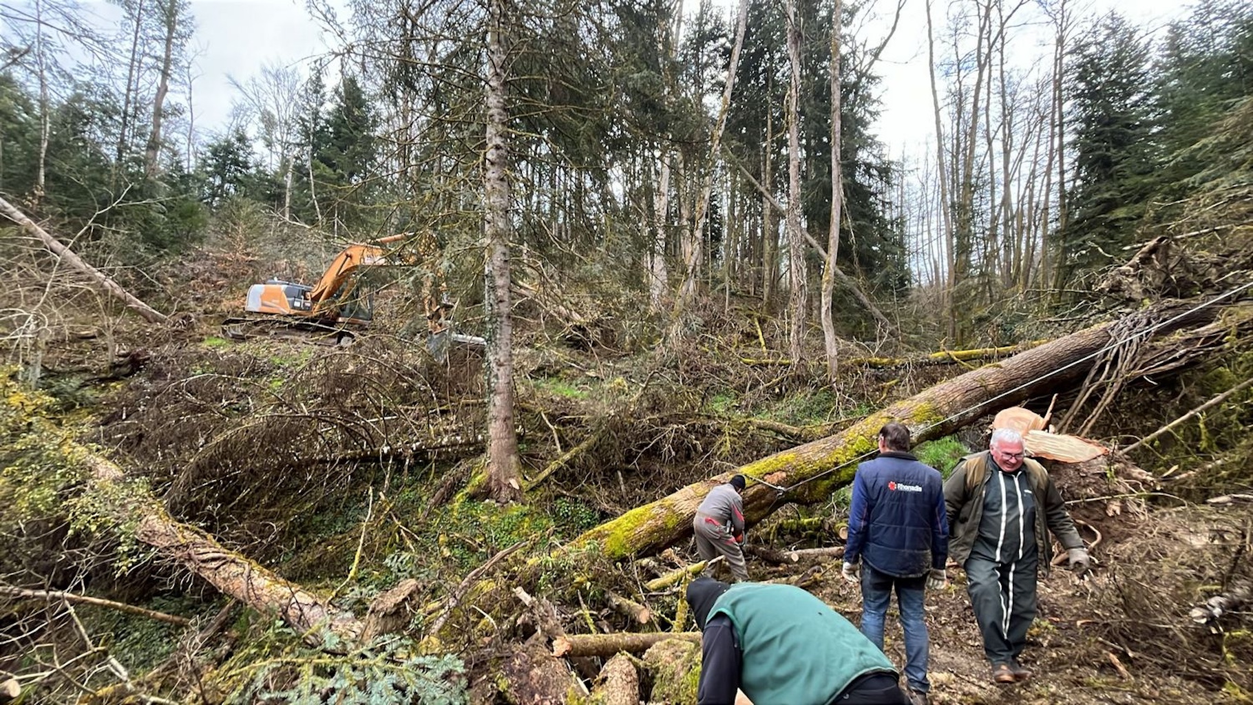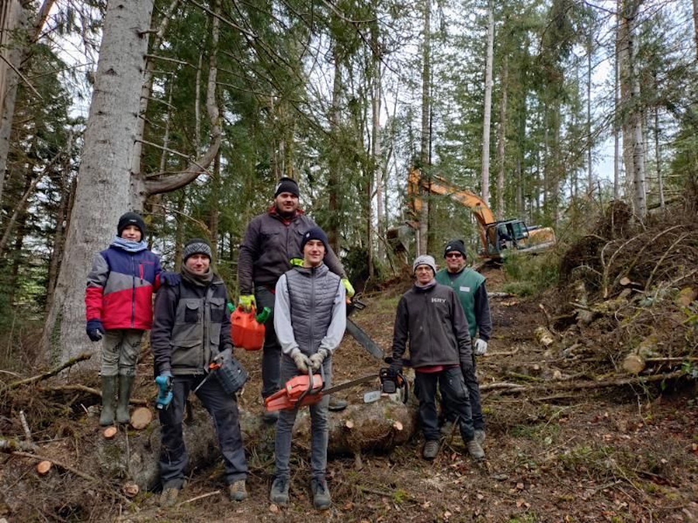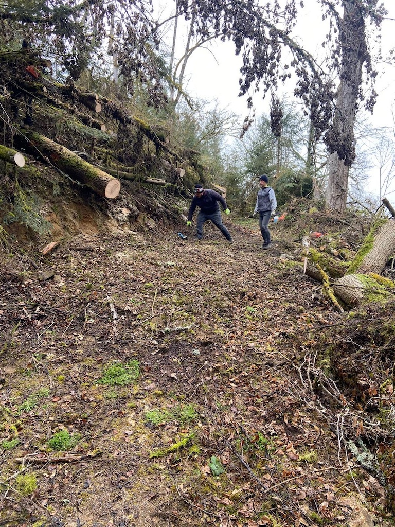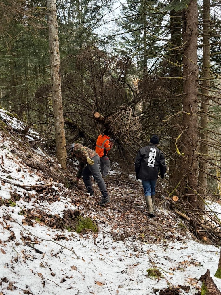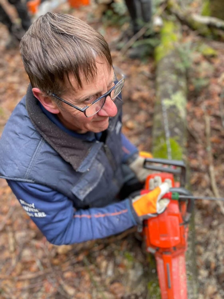 Deux équipes ont été constituées. L’une sur le secteur de Bertignat pour réouvrir le chemin entre Flouvat et le Bost. Ce dernier était complétement bouché suite à la tempête du 1er Juin 2025. Il a fallu déployer les gros moyens avec des engins forestiers et une pelleteuse afin de venir à bout des énormes arbres tombés en travers du sentier.