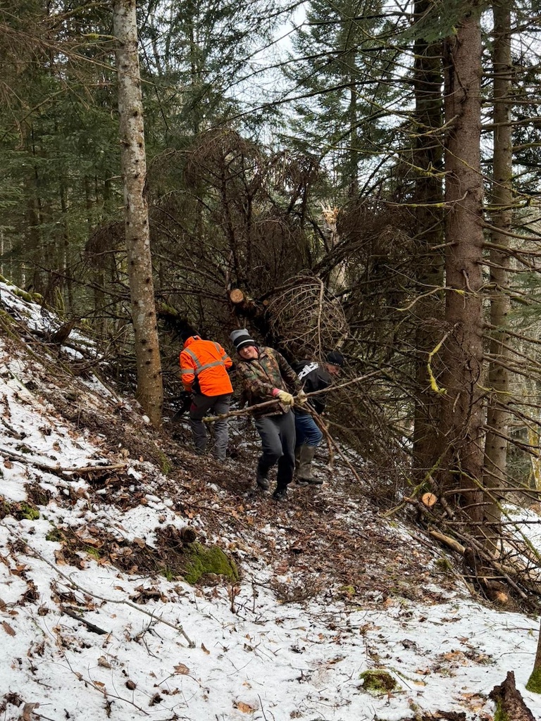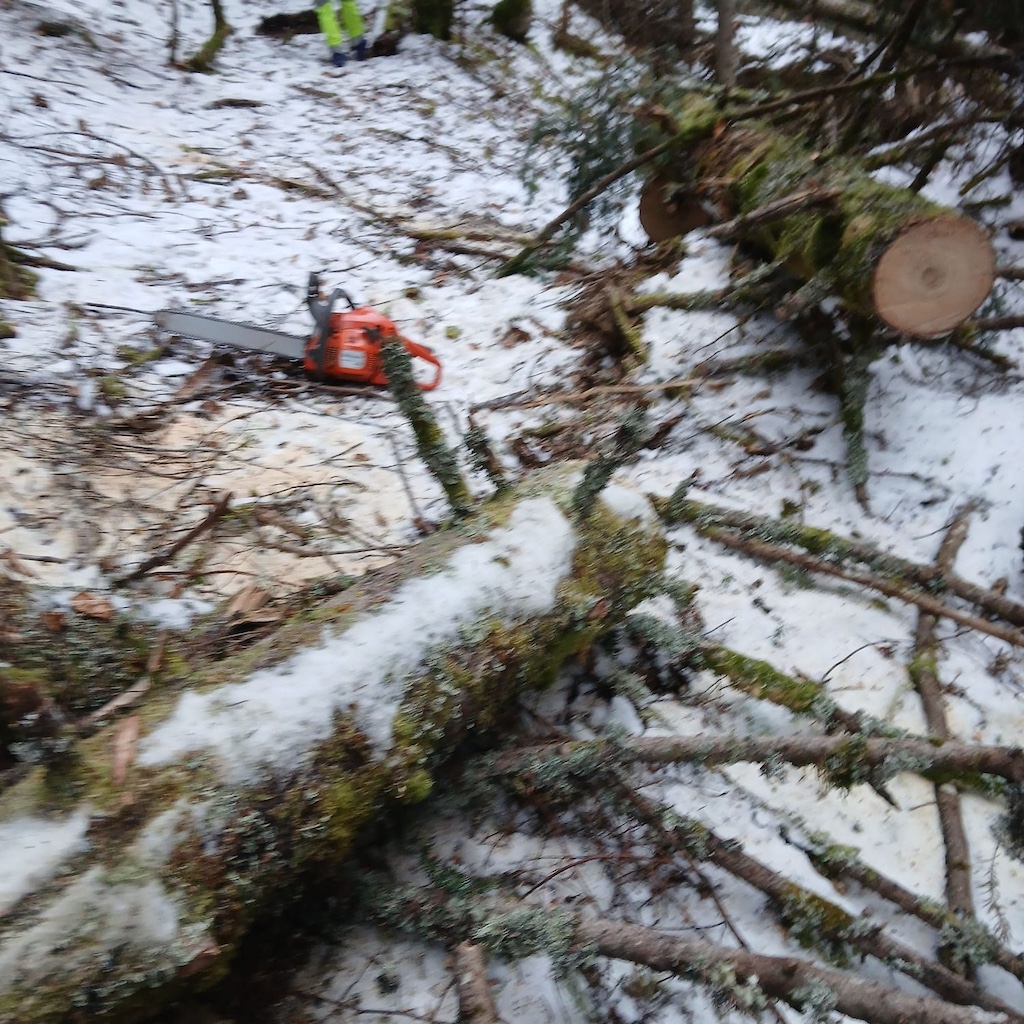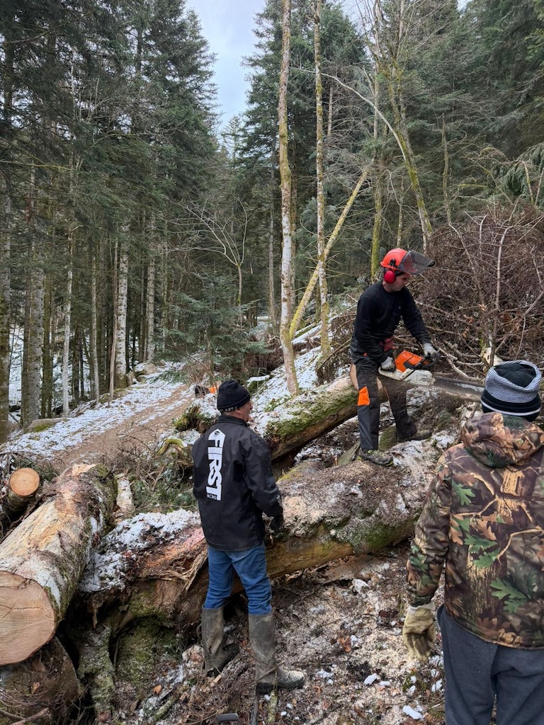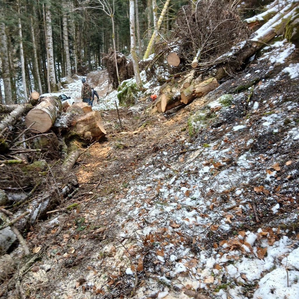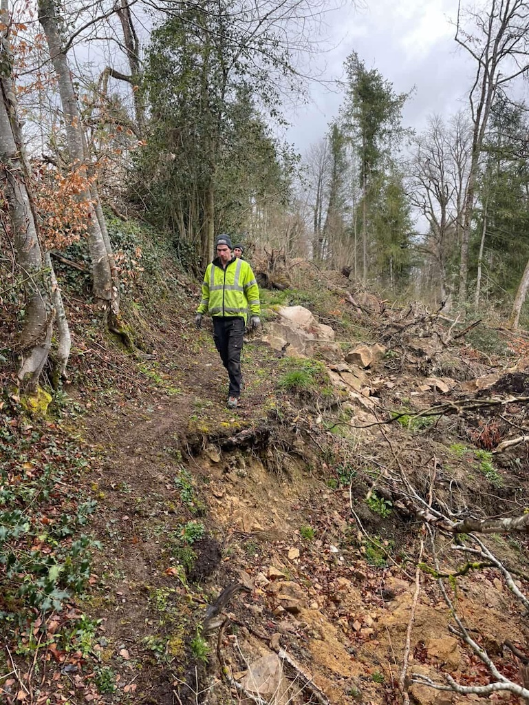 Deux équipes ont été constituées. L’une sur le secteur de Bertignat pour réouvrir le chemin entre Flouvat et le Bost. Ce dernier était complétement bouché suite à la tempête du 1er Juin 2025. Il a fallu déployer les gros moyens avec des engins forestiers et une pelleteuse afin de venir à bout des énormes arbres tombés en travers du sentier.