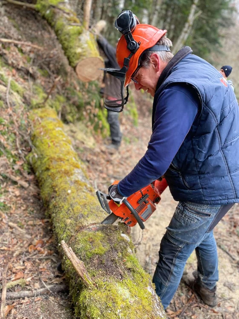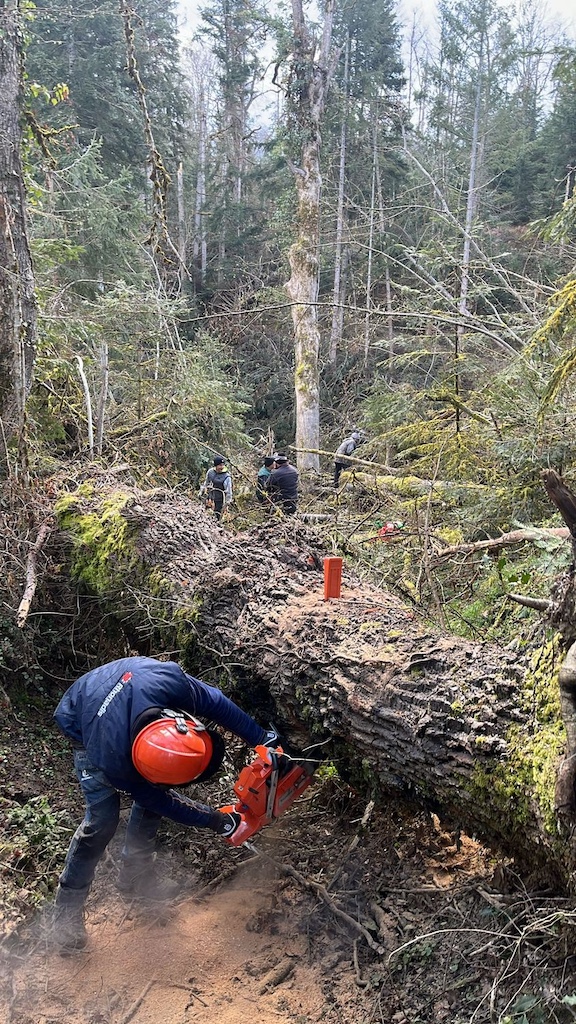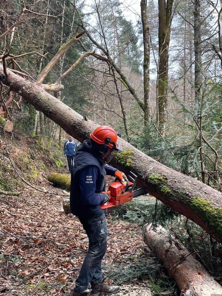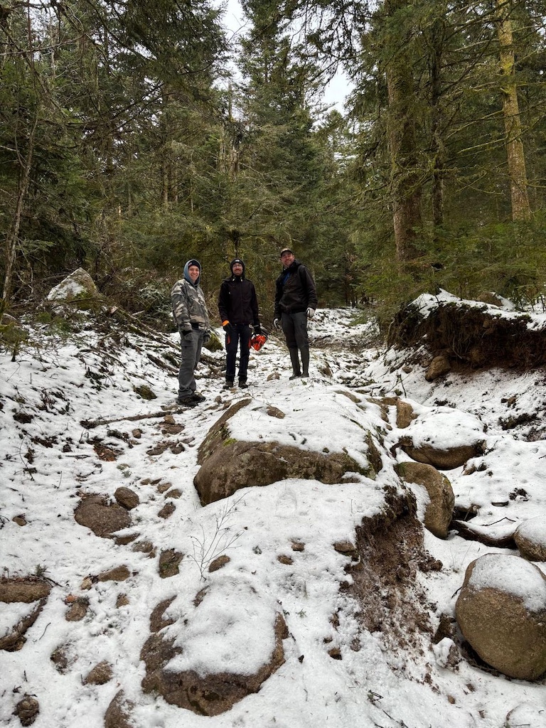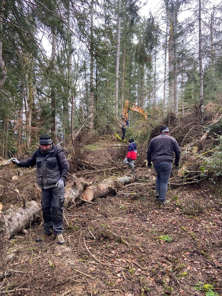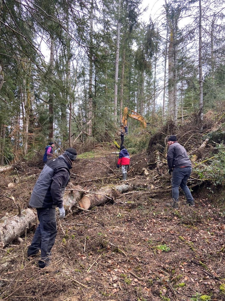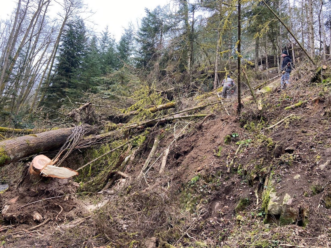 Deux équipes ont été constituées. L’une sur le secteur de Bertignat pour réouvrir le chemin entre Flouvat et le Bost. Ce dernier était complétement bouché suite à la tempête du 1er Juin 2025. Il a fallu déployer les gros moyens avec des engins forestiers et une pelleteuse afin de venir à bout des énormes arbres tombés en travers du sentier.